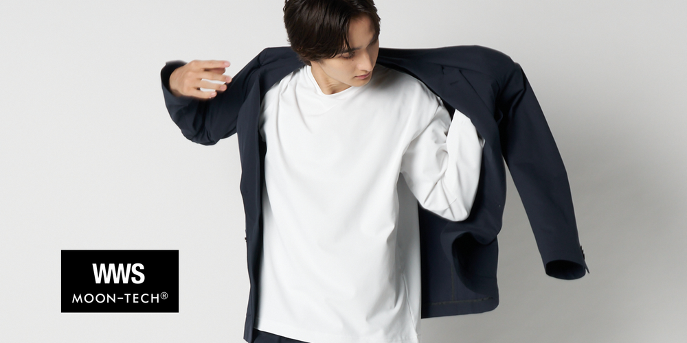「スーツに見える作業着」という「服の在り方を変える」商品を創造し、累計25万着以上の販売を達成した「WWS(ダブリューダブリューエス)」とのコラボレーションロングスリーブTシャツ。